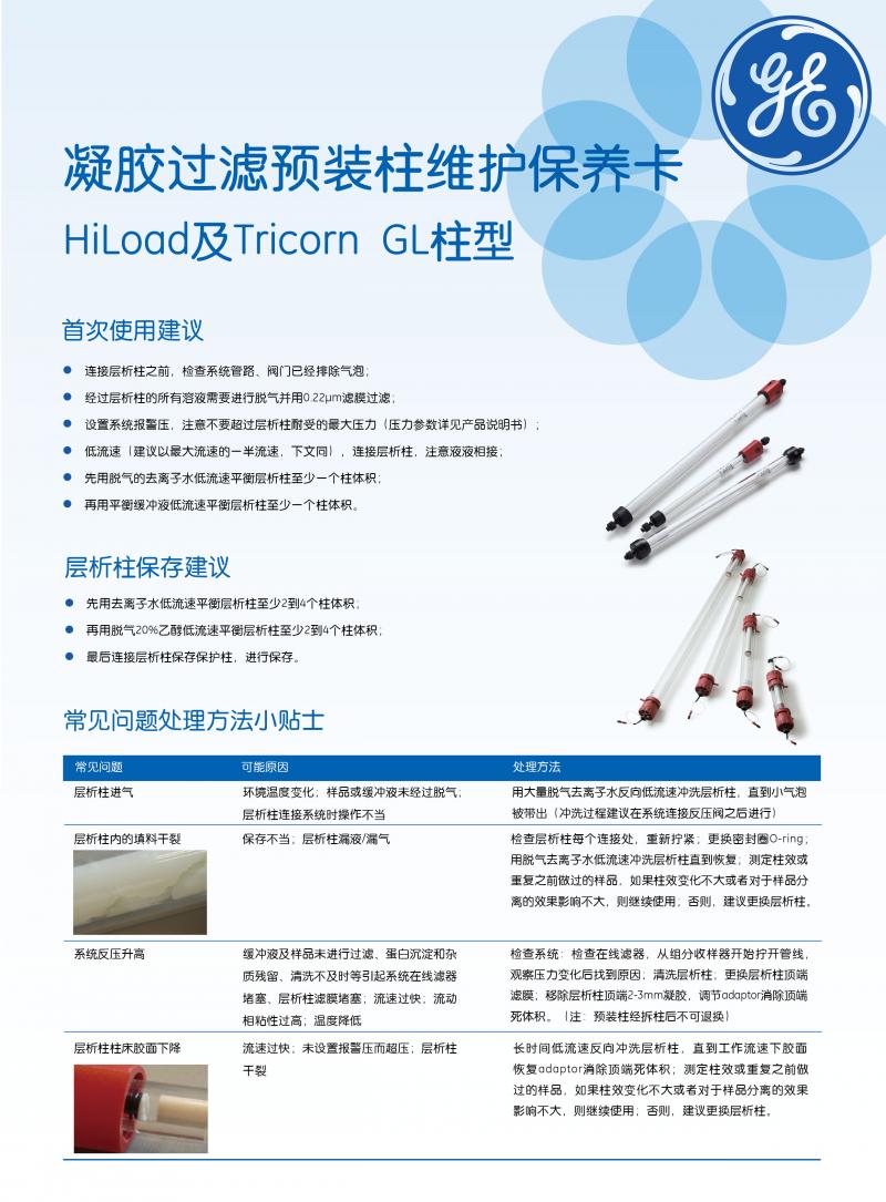 凝胶过滤预装柱维护保养卡 HiLoad及Tricorn GL柱型