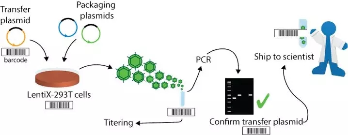 每个病毒颗粒的分发还包括相关质粒的DNA,这些DNA是从生产病毒的原始质粒中提取出来的样本。首先需要确保你有权使用原始质粒,才能给您提供Addgene的完整病毒颗粒。
