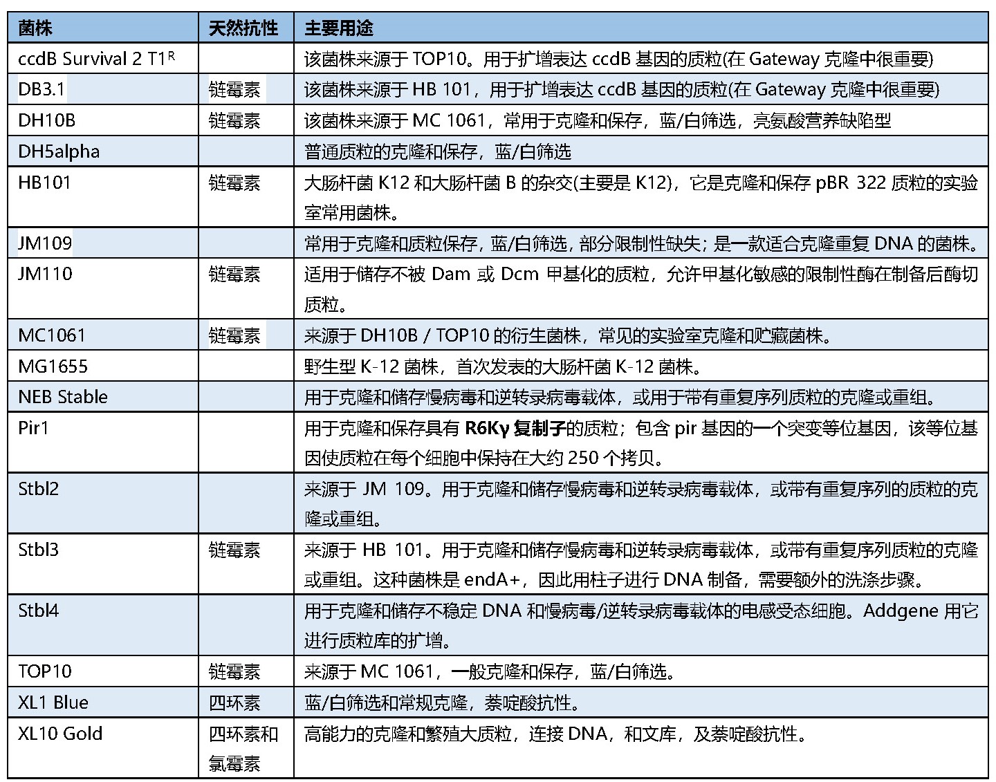 更多信息请查看addgene Blog:https://blog.addgene.org/plasmids-101-common-lab-e-coli-strains