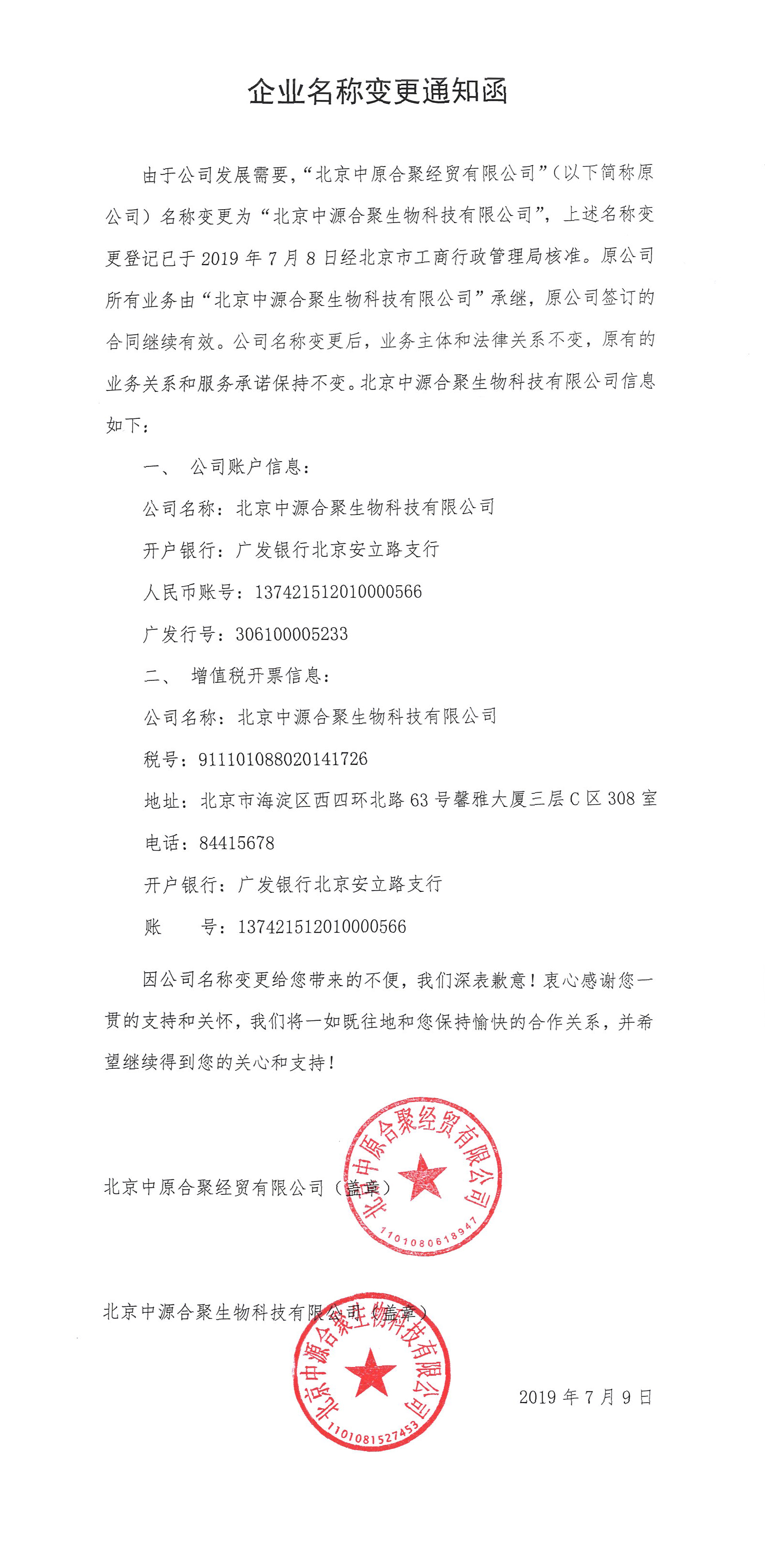 由于公司业务发展需要,“北京中原合聚经贸有限公司”(以下简称原公司)名称变更为“乐鱼官方网站”。上述名称变更登记已与2019年7月8日经北京市工商行政管理局海淀分局核准。