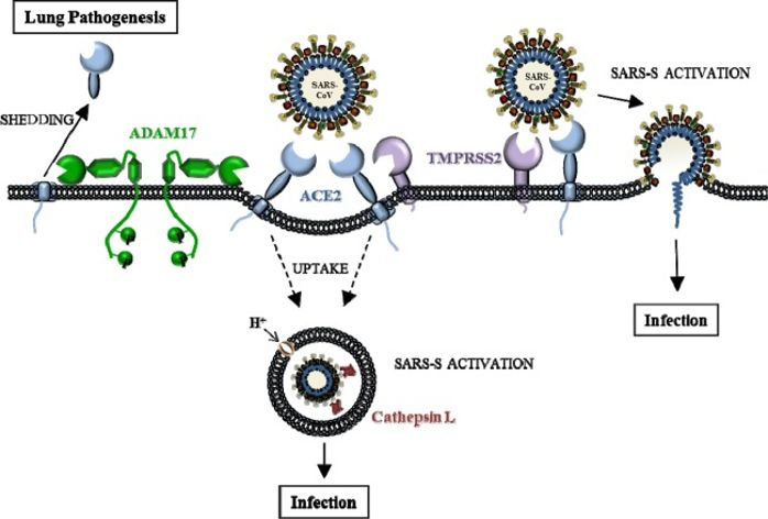 病毒 RNA 进入细胞内,复制并组装完成后,会被 ACE2 连在细胞膜上,ACE2 被跨膜蛋白酶(ADAM17)剪断,病毒就可以离开宿主细胞继续下一轮的侵袭。