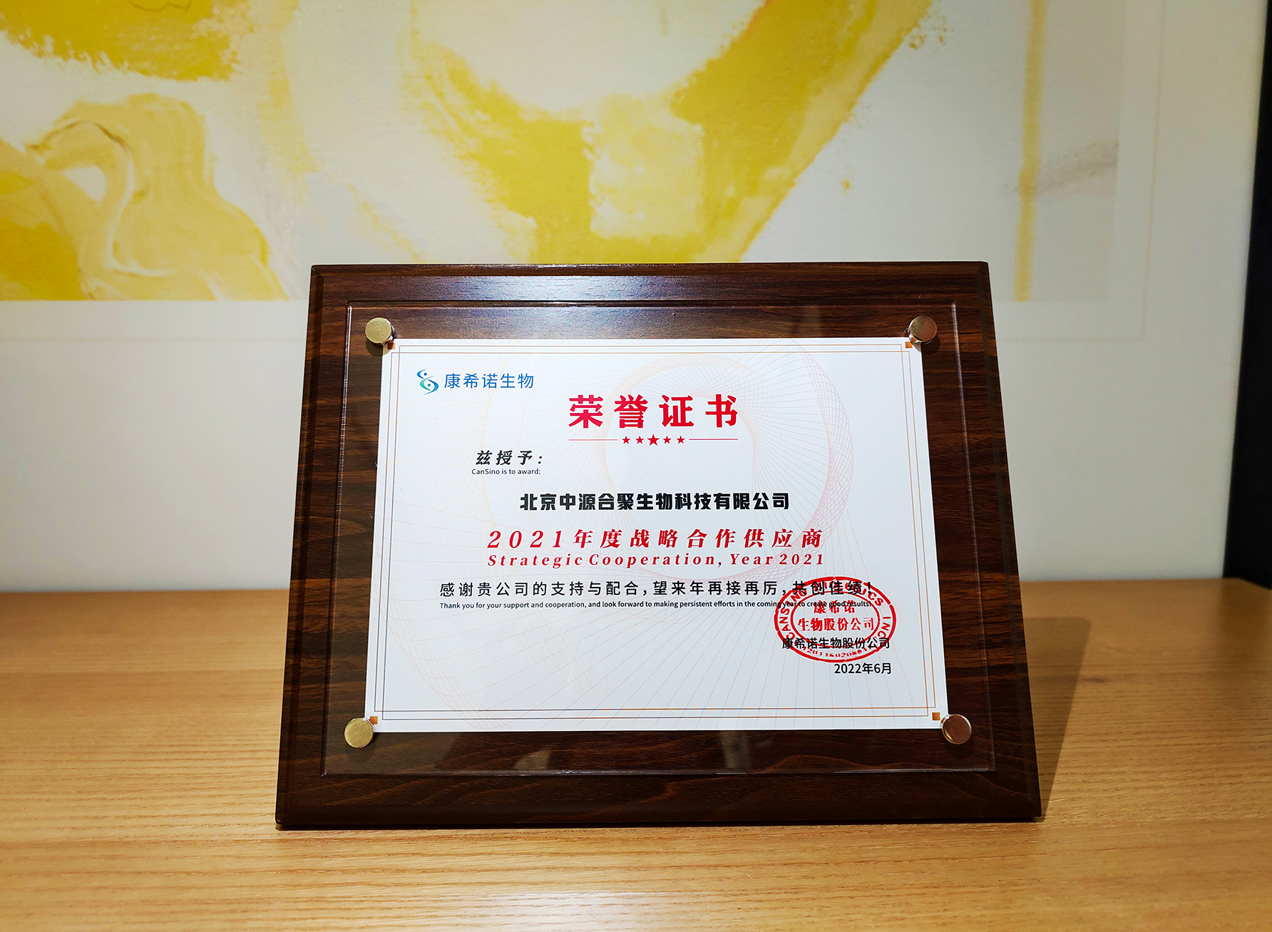荣获 康希诺生物 2021年度战略合作供应商
