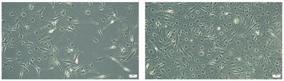 图2、hTERT永生化新生儿黑色素细胞形态与典型的黑色素细胞形态类似。用高倍和低倍倒置显微镜在10倍物镜下拍摄贴壁黑色素细胞的融合图像。(比例尺为82微米)
