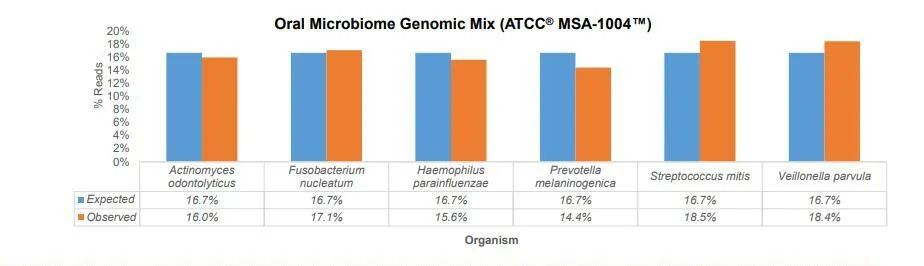 ATCC通过使用两种商业化核酸提取试剂盒对口腔拭子标准品分别做提取实验(图2),与预期结果做对比以此来优化核酸提取方法。(口腔拭子基因组标准品ATCC® MSA-1004™和口腔拭子全菌株标准品ATCC® MSA-2004™,均为通过细胞计数等量分配菌株或经荧光定量后等量分配基因组拷贝数产品。)