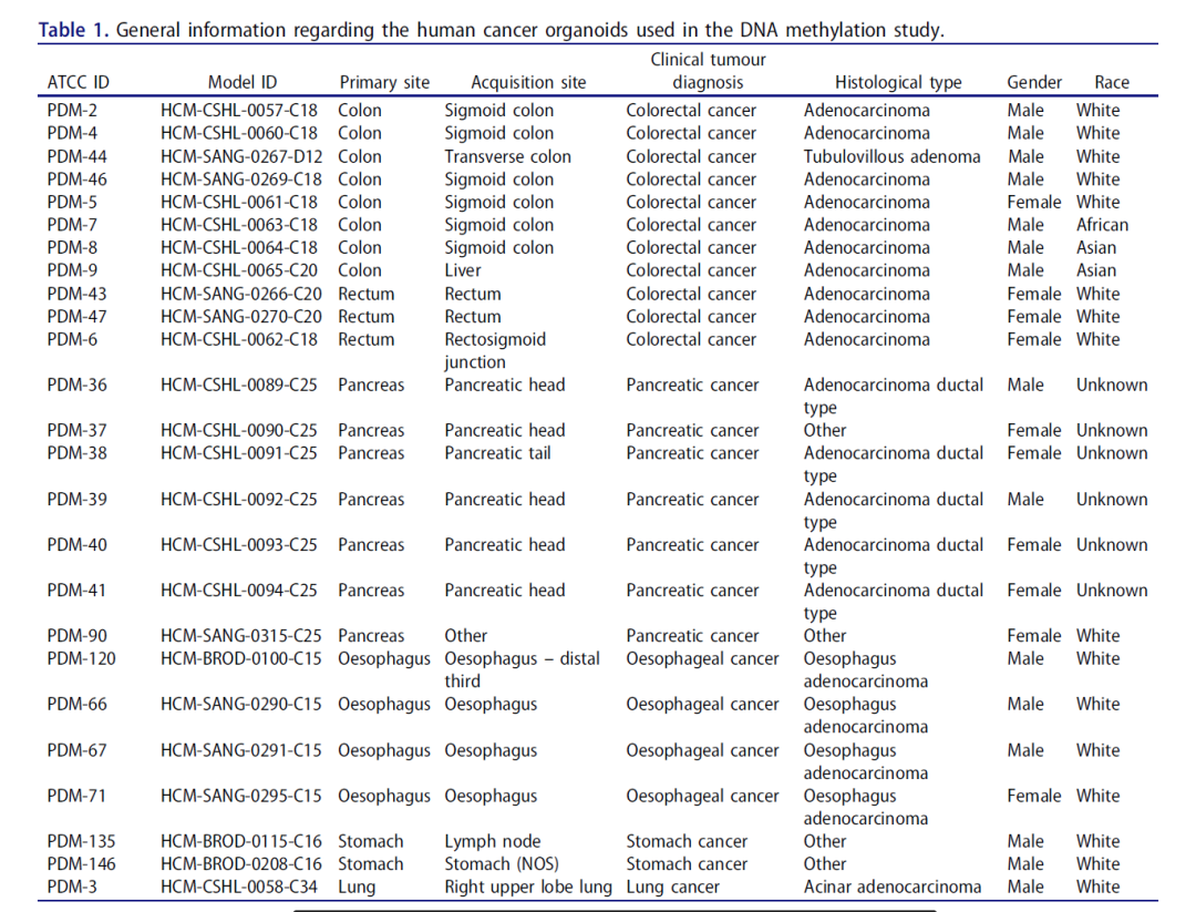 The DNA methylation landscape of human cancer organoids available at the American type culture collection,(https://doi.org/10.1080/15592294.2020.1762398),这篇文章提供了25种人类癌症类器官的表观遗传指纹特征。已开发的研究表明,这些肿瘤模型对生物医学研究界和制药公司开发抗癌药物非常有用。